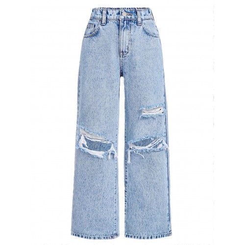 FEDPOP Baggy Jeans for Girls Wide Leg Ripped High Elastic Waisted Denim Pants Cute Summer Trousers Y2K Streetwear 10-14Y